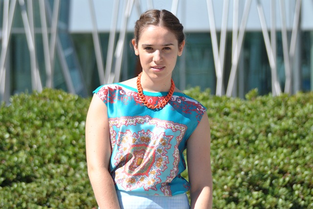 La he combinado con mi camiseta favorita de print de pañuelo y complementos en nude y coral.