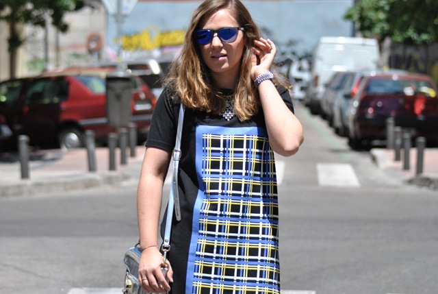 Hoy os enseño mi última comprita en Asos, este vestido negro con detalles en color azul y amarillo, que he combinado con complementos en plateado y mis gafas de sol favoritas de espejo.