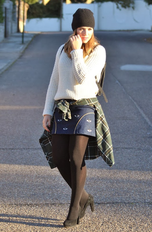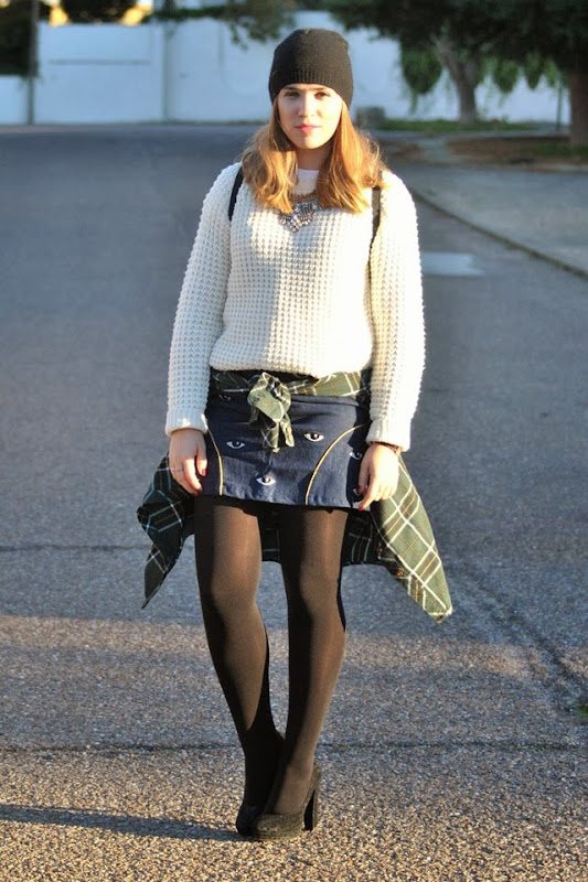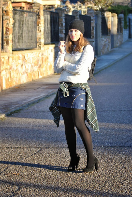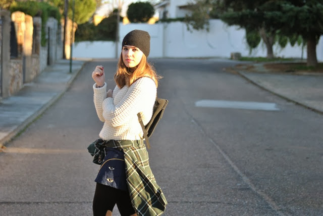 Por eso, cuando encontré esta inspiración no pude evitar incluirla en mis looks. Esta vez la he combinado de manera muy informal con jersey gordito y camisa de cuadros y, para ir super cómoda, he cambiado el bolso por una mochila.