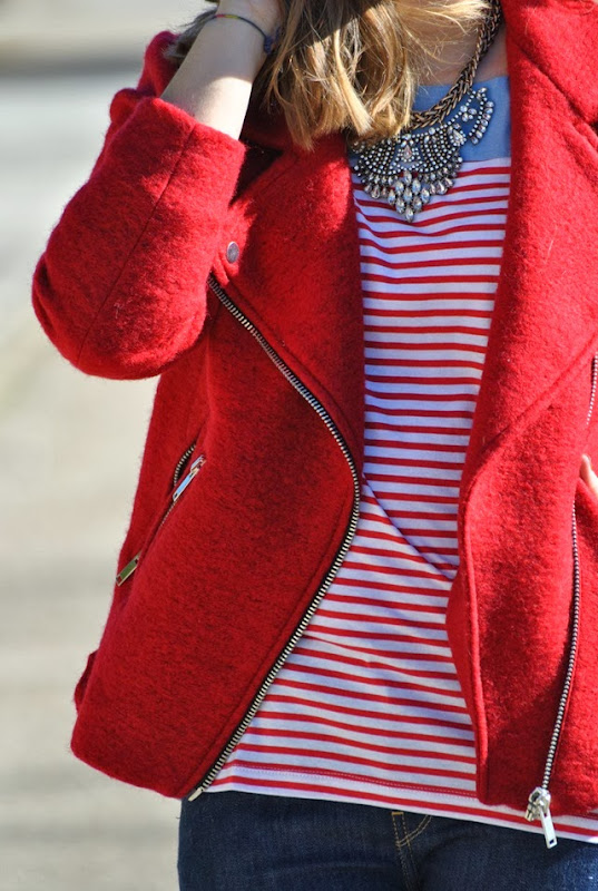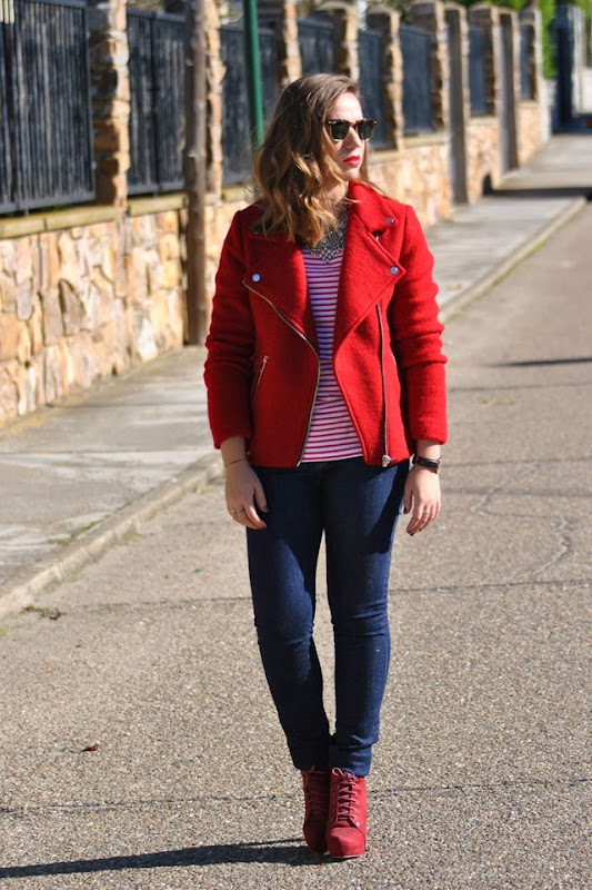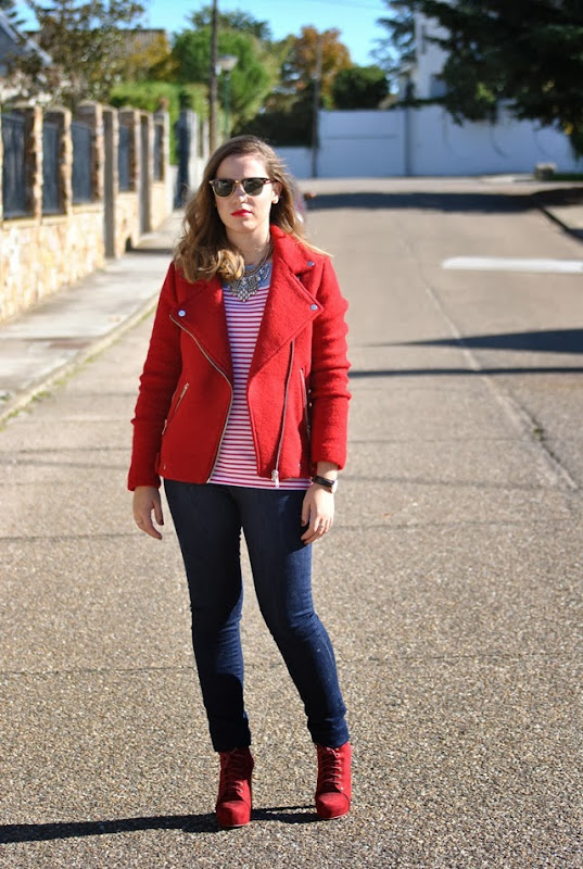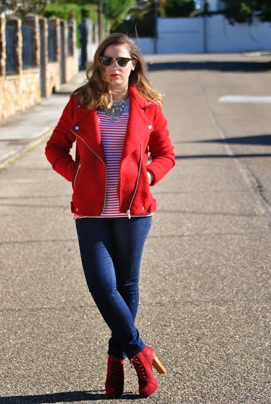 Hoy os enseño otro look con mi adorada biker roja, esta vez dandole un puntazo rockero con botines de maxi plataforma y camiseta marinera en el mismo tono.