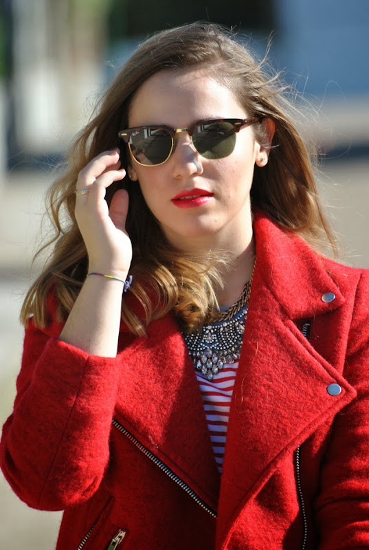 A esta cazadora le estoy viendo un sinfín de posibilidades, y no paro de pensar looks con ella. Como complementos perfectos para el look unas gafas setenteras y un lipstick rojo.
